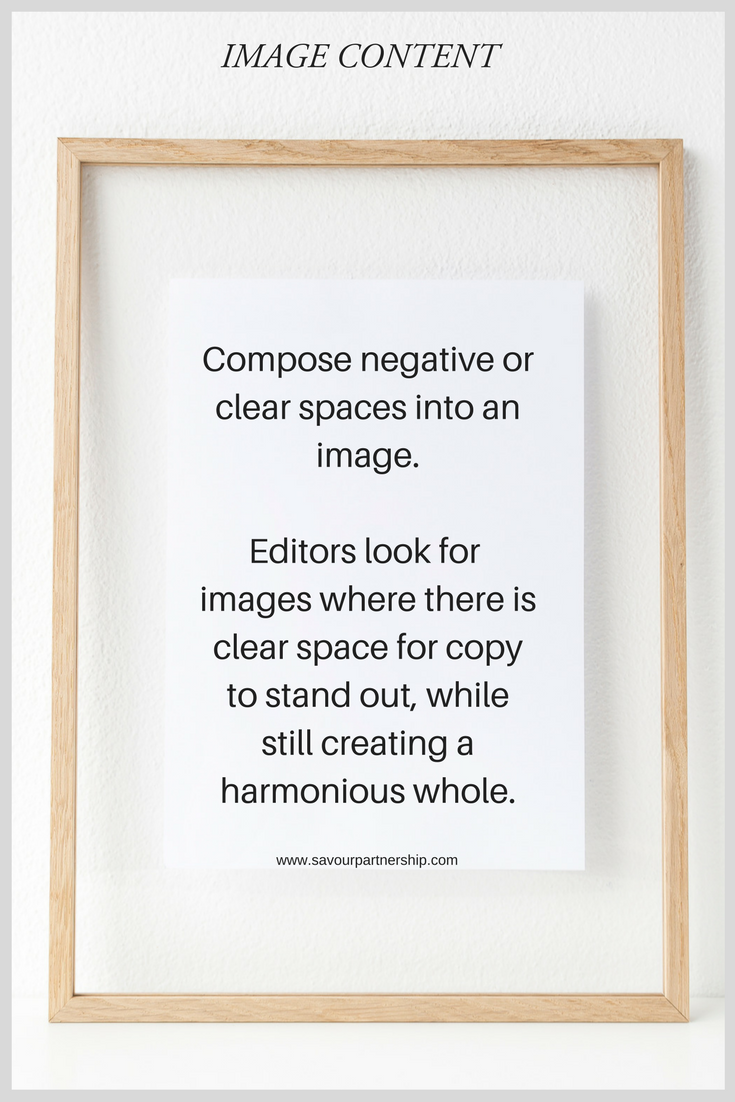 Magazine editors are looking for images, especially for covers, where there is negative or *clear* space, where text can be laid out and seen, to create a harmonious whole.