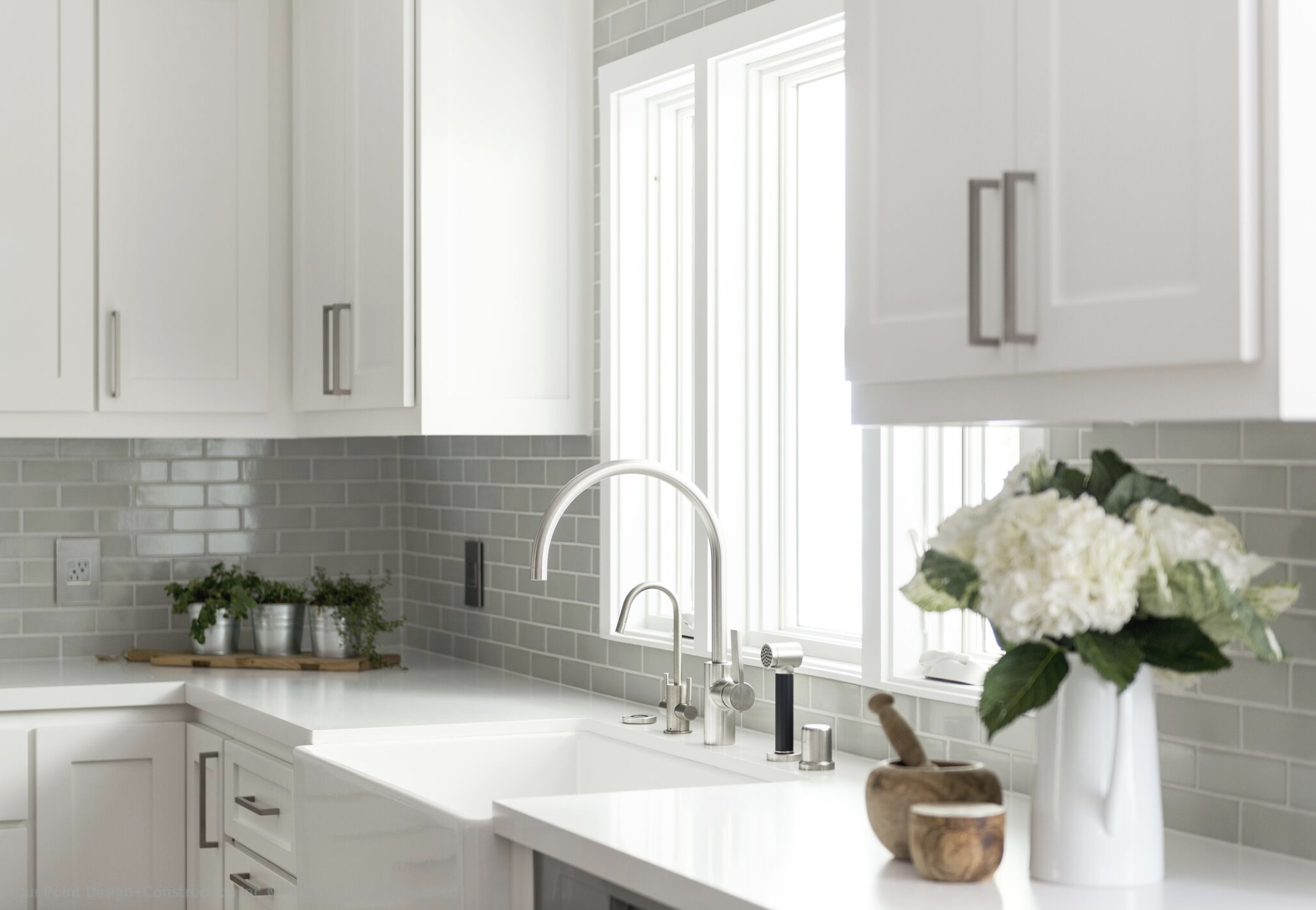 Notice the styling and editing of the image below, of a kitchen by Four Point Design Build, and how there is not a single element in it that is non-essential to the story they want to tell about the calm and peace inherent in their design work.