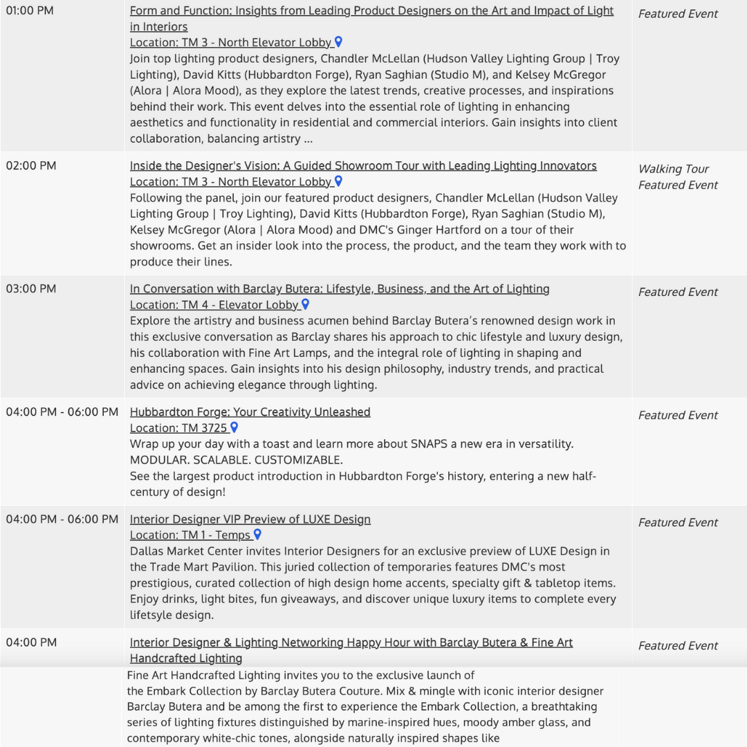 Speaking of Interior Designer Preview Day, the following 3 images showcase the programming going on for that day. I’m especially looking forward to hearing Barclay speak at Fine Art Lighting, as his take on business is always intelligent and well informed.