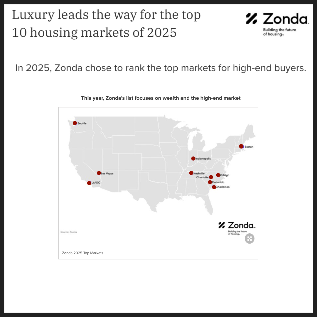 Zonda, the country’s premier source of data for the housing industry, recently published its 2025 report on the Top 10 Housing Markets For Luxury Home Buyers.